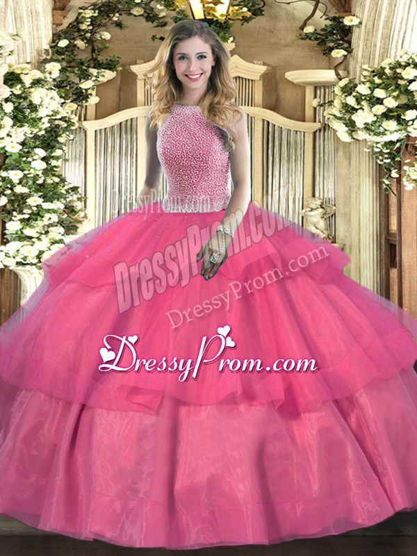 Neckline : High-neckShown Color : Hot PinkSilhouette : Ball GownsSleeve Length : sleevelessHemline : floor lengthBack Detail : Lace upFabric : TulleEmbellishment : Beading,Ruffled LayersOccasion : Military Ball,Sweet 16,QuinceaneraSeason : Spring,Summer,Fall,Winter