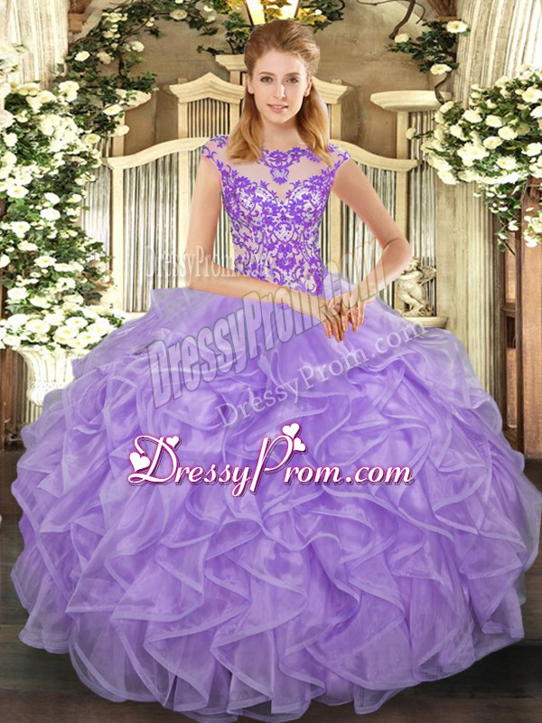 Neckline : ScoopShown Color : LavenderSilhouette : Ball GownsSleeve Length : cap sleevesHemline : floor lengthBack Detail : Lace upFabric : OrganzaEmbellishment : Beading,Appliques,RufflesOccasion : Sweet 16,QuinceaneraSeason : Spring,Summer,Fall,Winter