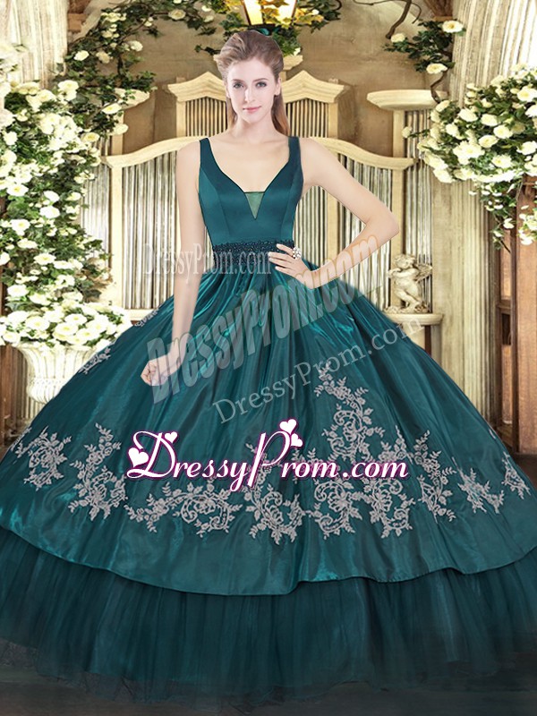 Neckline : StrapsShown Color : Teal Silhouette : Ball GownsSleeve Length : sleevelessHemline : floor lengthBack Detail : ZipperFabric : Organza,TaffetaEmbellishment : Beading,EmbroideryOccasion : Military Ball,Sweet 16,QuinceaneraSeason : Spring,Summer,Fall,Winter