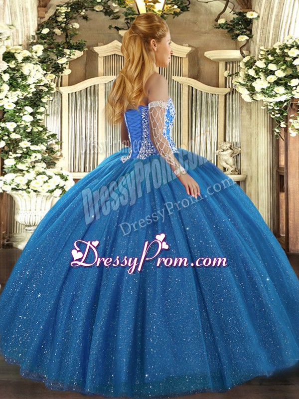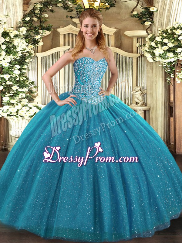 Eye-catching Sleeveless Tulle Floor Length Lace Up Vestidos de Quinceanera in Teal with Beading