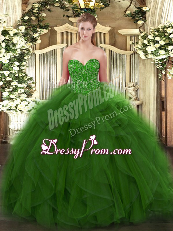 Green Ball Gowns Sweetheart Sleeveless Tulle Floor Length Lace Up Beading Quinceanera Dress