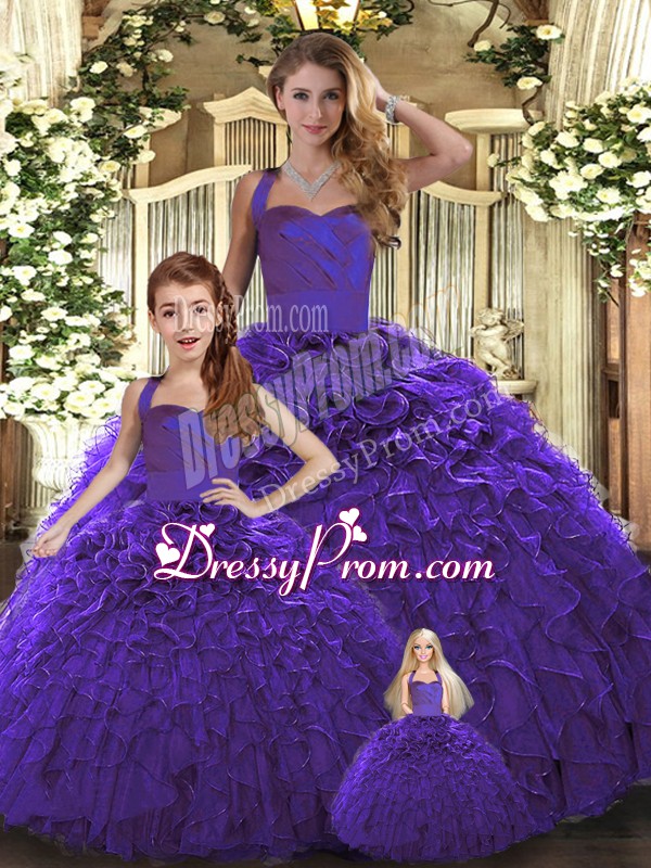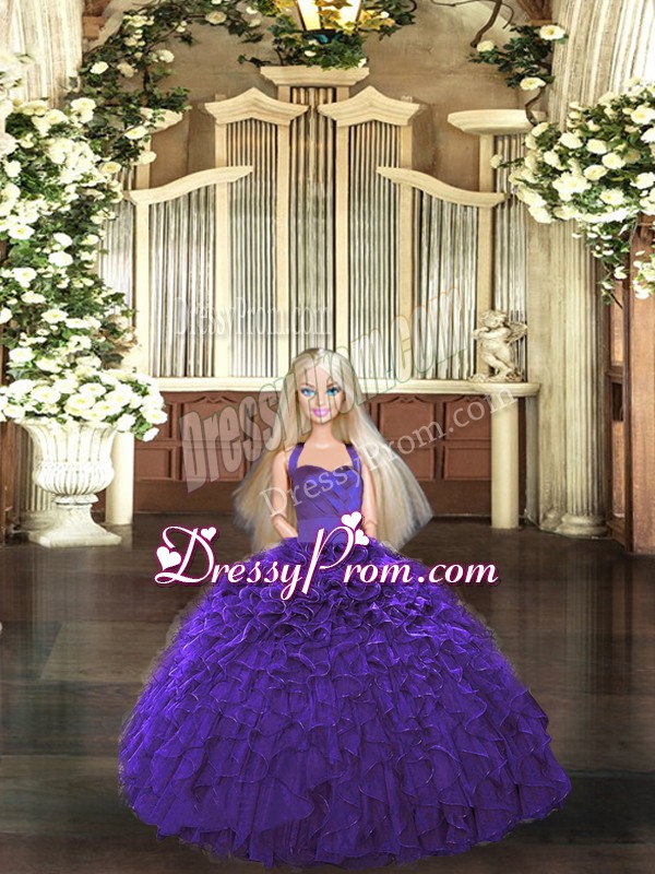Neckline : Halter topShown Color : PurpleSilhouette : Ball GownsSleeve Length : sleevelessHemline : floor lengthBack Detail : Lace upFabric : OrganzaEmbellishment : RufflesOccasion : Military Ball,Sweet 16,QuinceaneraSeason : Spring,Summer,Fall,Winter