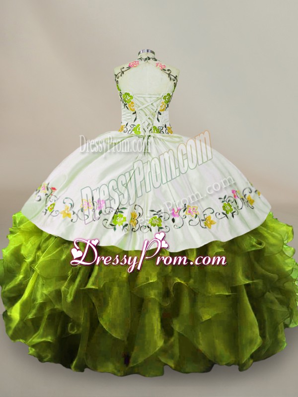 Neckline : Halter topShown Color : Olive GreenSilhouette : Ball GownsSleeve Length : sleevelessHemline : floor lengthBack Detail : Side zipperFabric : OrganzaEmbellishment : Embroidery,RufflesOccasion : Sweet 16,QuinceaneraSeason : Spring,Summer,Fall,Winter