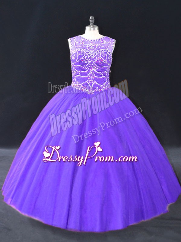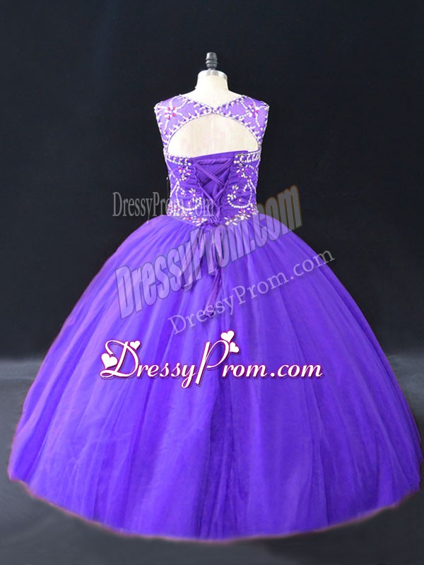 Neckline : Halter topShown Color : PurpleSilhouette : Ball GownsSleeve Length : sleevelessHemline : floor lengthBack Detail : Lace upFabric : TulleEmbellishment : BeadingOccasion : Sweet 16,QuinceaneraSeason : Spring,Summer,Fall