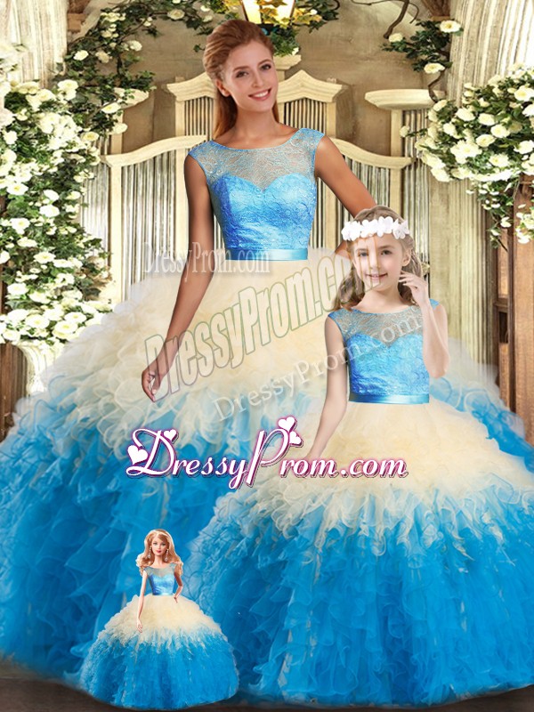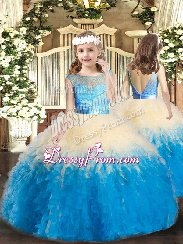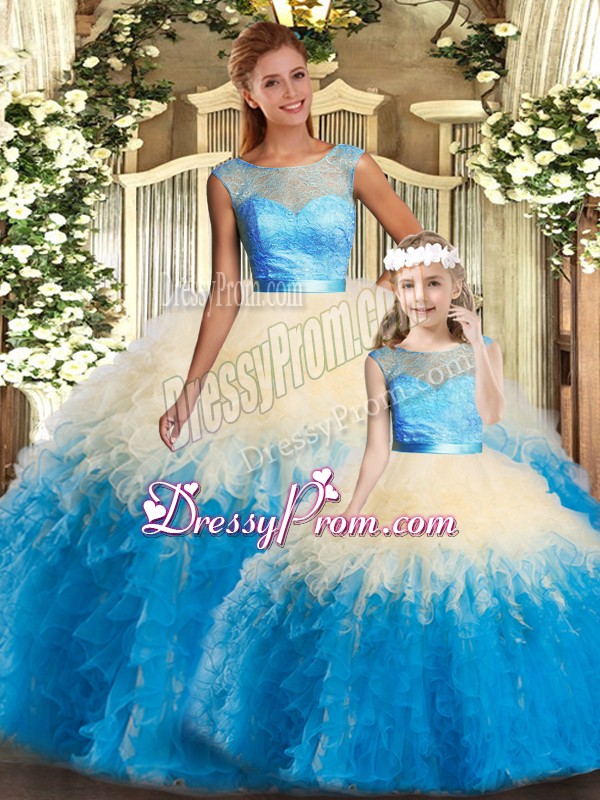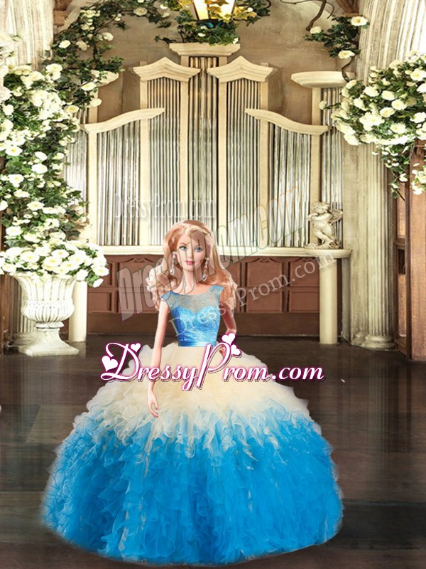 Neckline : ScoopShown Color : Multi-colorSilhouette : Ball GownsSleeve Length : sleevelessHemline : floor lengthBack Detail : BacklessFabric : OrganzaEmbellishment : Lace,RufflesOccasion : Military Ball,Sweet 16,QuinceaneraSeason : Spring,Summer,Fall,Winter