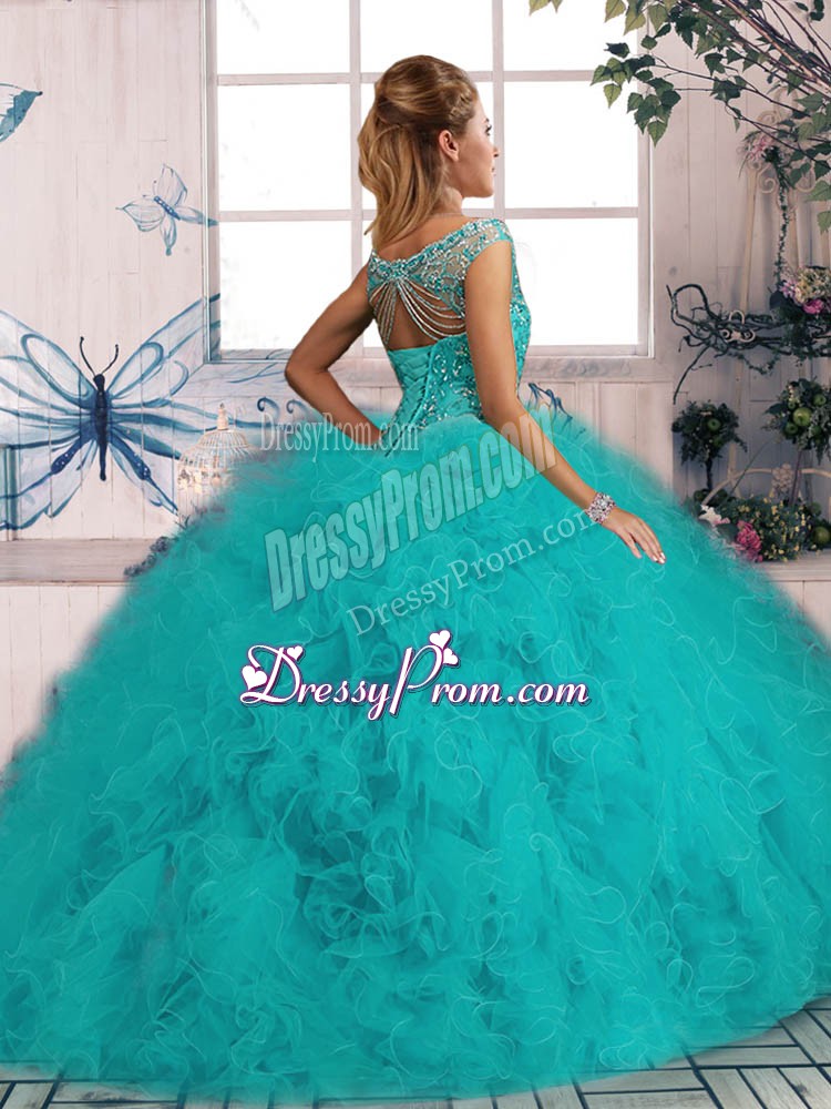 Neckline : Off the shoulderShown Color : TurquoiseSilhouette : Ball GownsSleeve Length : sleevelessBack Detail : Lace upFabric : TulleEmbellishment : Beading,RufflesOccasion : Sweet 16Season : Spring,Summer,Fall,Winter