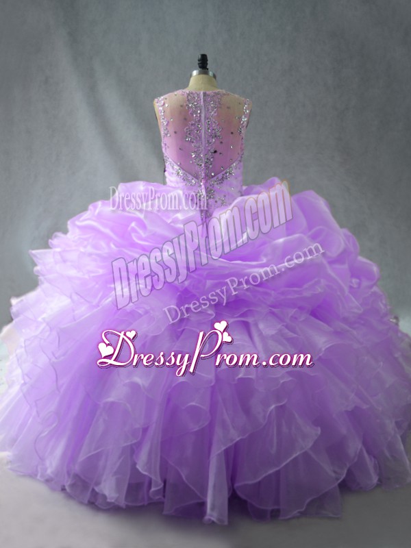 Neckline : StrapsShown Color : LavenderSilhouette : Ball GownsSleeve Length : sleevelessHemline : floor lengthBack Detail : ZipperFabric : OrganzaEmbellishment : Beading,RufflesOccasion : Sweet 16,QuinceaneraSeason : Spring,Summer,Fall,Winter