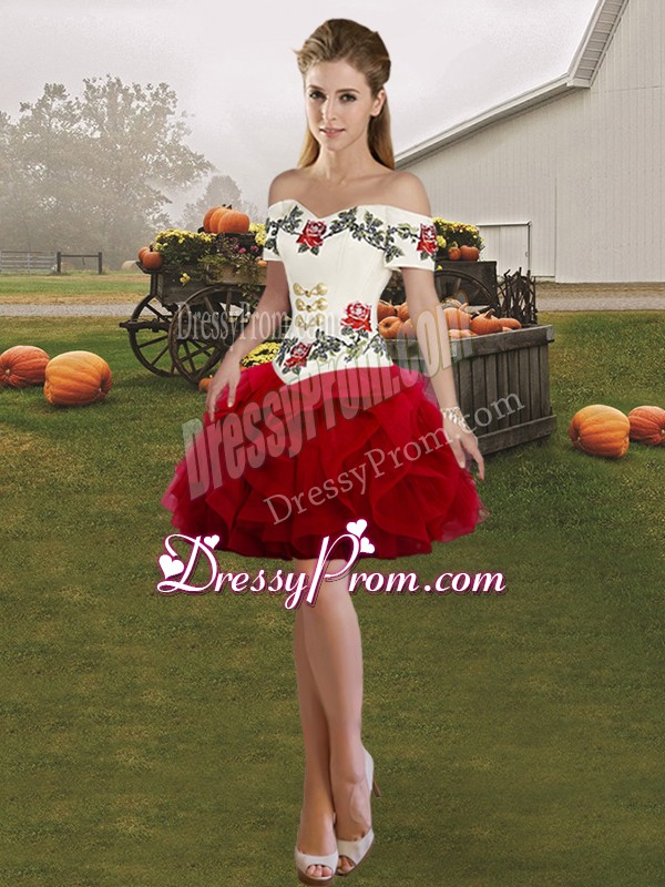 Neckline : Off the shoulder Shown Color : Wine Red Silhouette : Ball Gowns Sleeve Length : sleeveless Hemline : mini length Back Detail : Lace up Fabric : Tulle Embellishment : Embroidery,Ruffles Occasion : Prom,Party Season : Spring,Summer,Fall