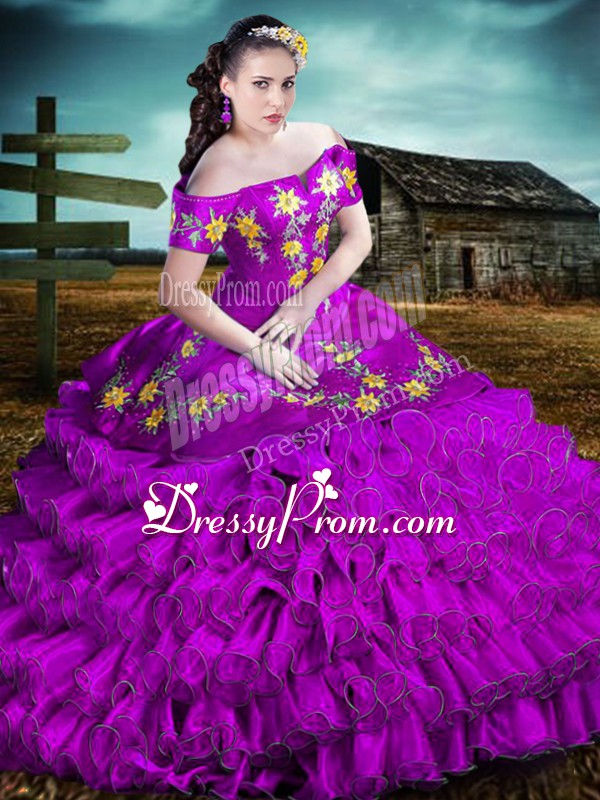 Neckline : Off the shoulderShown Color : PurpleSilhouette : Ball GownsSleeve Length : sleevelessHemline : floor lengthBack Detail : Lace upFabric : OrganzaEmbellishment : Embroidery,RufflesOccasion : Sweet 16,QuinceaneraSeason : Spring,Summer,Fall,Winter