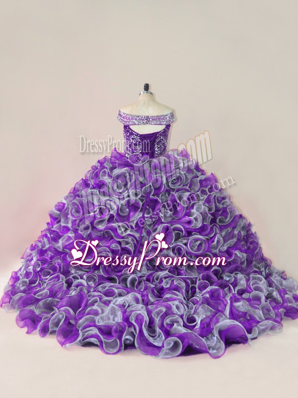Neckline : Off the shoulderShown Color : Multi-colorSilhouette : Ball GownsSleeve Length : sleevelessBack Detail : Lace upFabric : OrganzaEmbellishment : Beading,RufflesOccasion : Sweet 16,QuinceaneraSeason : Spring,Summer,Fall,Winter