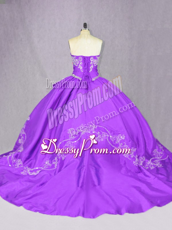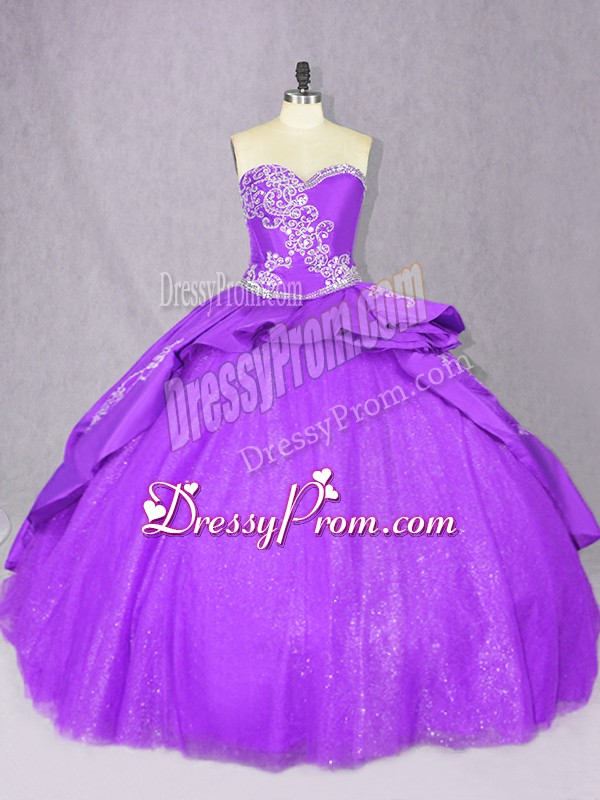Neckline : SweetheartShown Color : PurpleSilhouette : Ball GownsSleeve Length : sleevelessBack Detail : Lace upFabric : TulleEmbellishment : BeadingOccasion : Sweet 16,QuinceaneraSeason : Spring,Summer,Fall,Winter