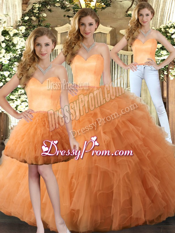 Neckline : SweetheartShown Color : OrangeSilhouette : Three PiecesSleeve Length : sleevelessHemline : floor lengthBack Detail : Lace upFabric : TulleEmbellishment : RufflesOccasion : Military Ball,Sweet 16,QuinceaneraSeason : Spring,Summer,Fall,Winter
