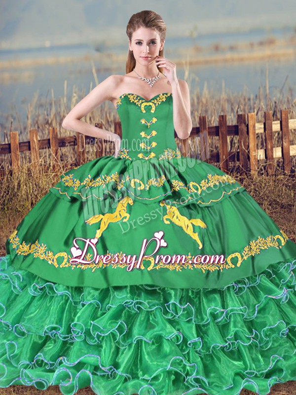 Neckline : SweetheartShown Color : TurquoiseSilhouette : Ball GownsSleeve Length : sleevelessBack Detail : Lace upFabric : Satin,OrganzaEmbellishment : Embroidery,Ruffled LayersOccasion : Sweet 16,QuinceaneraSeason : Spring,Summer,Fall,Winter