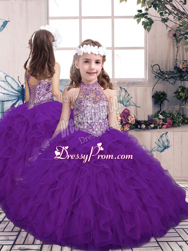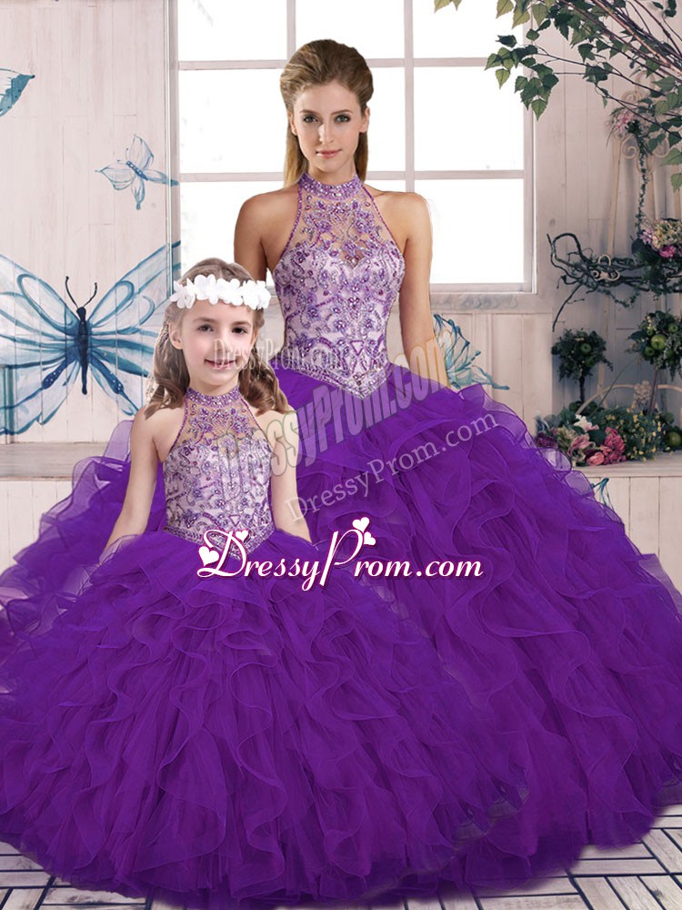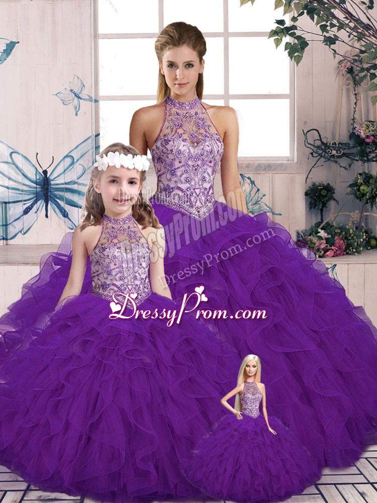 Neckline : Halter topShown Color : PurpleSilhouette : Ball GownsSleeve Length : sleevelessHemline : floor lengthBack Detail : Lace upFabric : TulleEmbellishment : Beading,RufflesOccasion : Military Ball,Sweet 16,QuinceaneraSeason : Spring,Summer,Fall,Winter