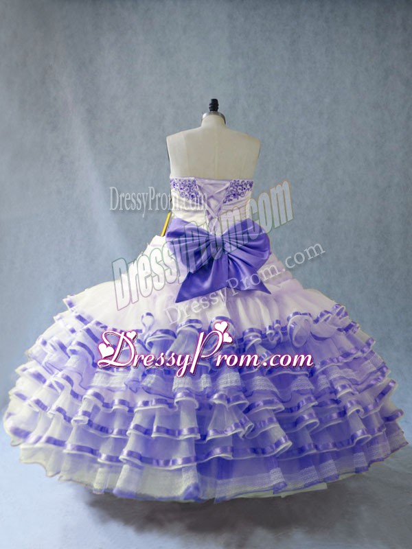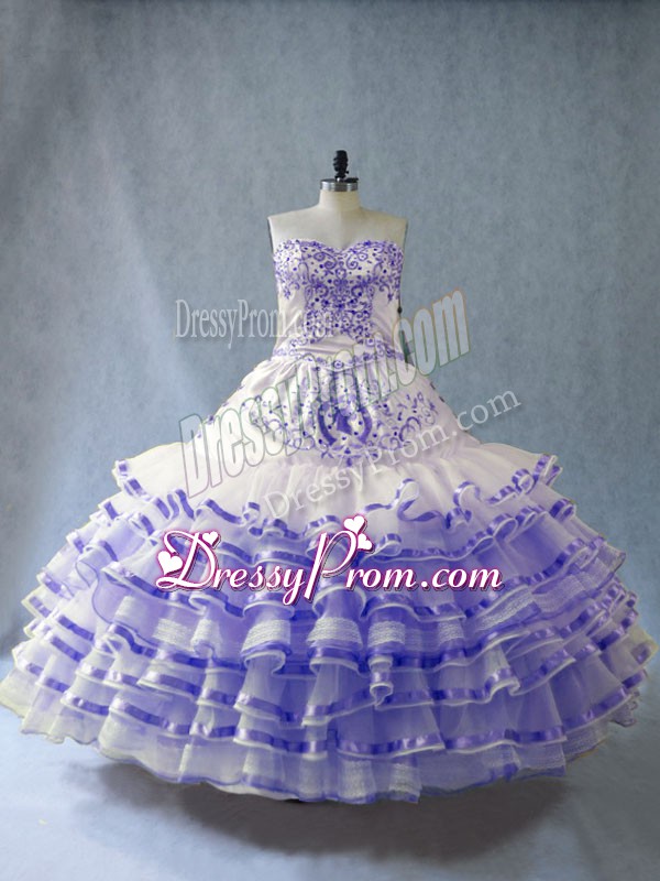 Neckline : SweetheartShown Color : LavenderSilhouette : Ball GownsSleeve Length : sleevelessHemline : floor lengthBack Detail : Lace upFabric : OrganzaEmbellishment : Embroidery,Ruffled LayersOccasion : Sweet 16,QuinceaneraSeason : Spring,Summer,Fall,Winter