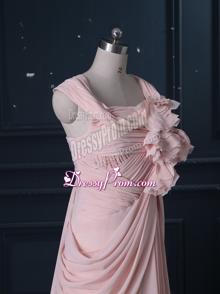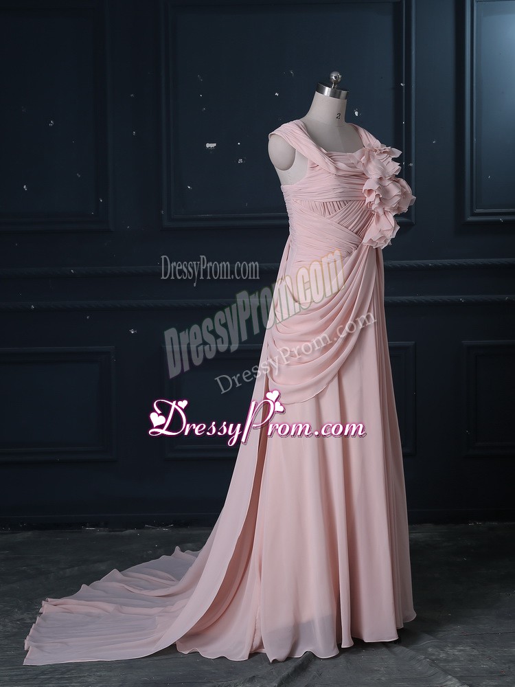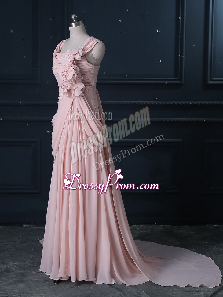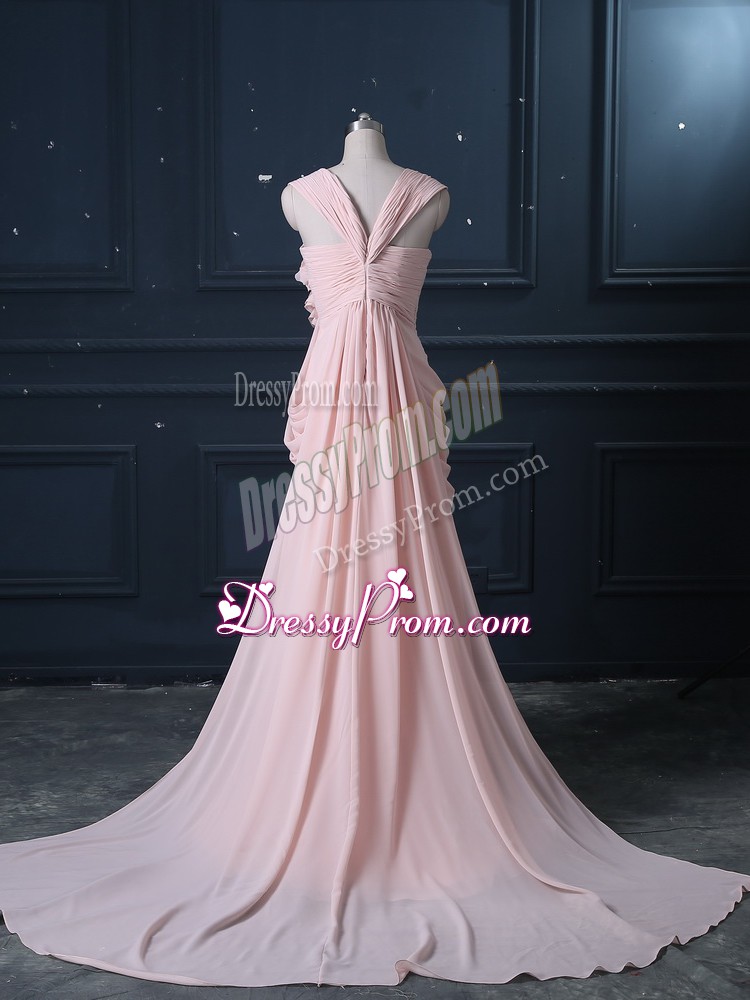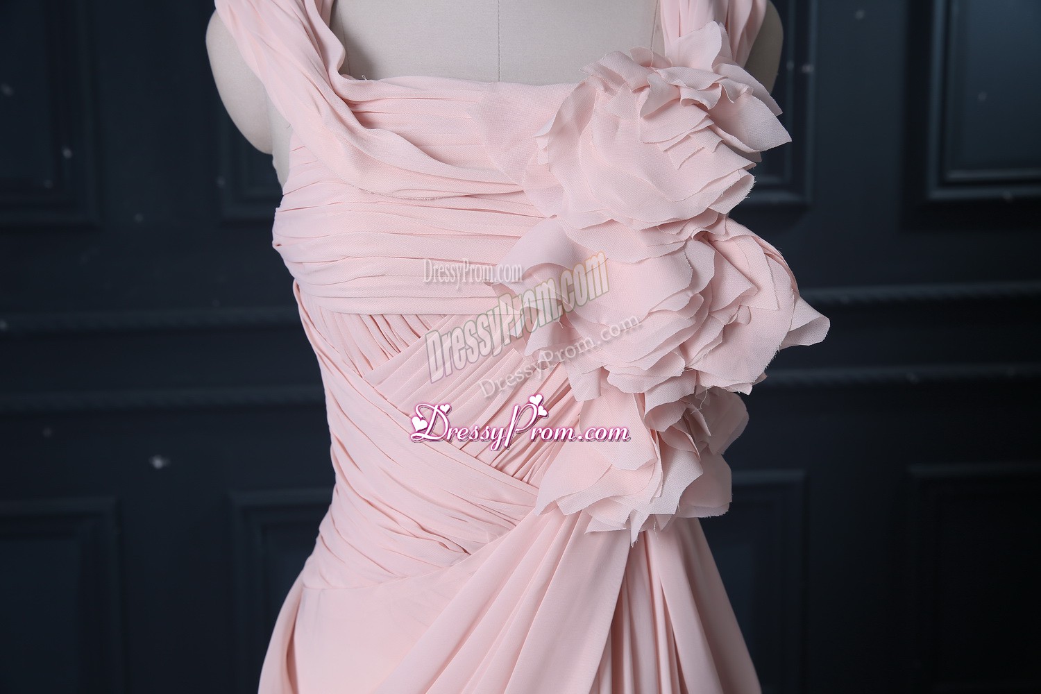 Neckline : StrapsShown Color : Pink Silhouette : Column/SheathSleeve Length : sleevelessBack Detail : ZipperFabric : ChiffonEmbellishment : RuchingOccasion : Prom,Party,Military BallSeason : Spring,Summer,Fall,Winter