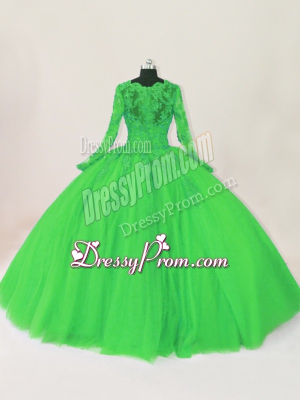 Neckline : ScallopedShown Color : GreenSilhouette : Ball GownsSleeve Length : long sleevesHemline : floor lengthBack Detail : ZipperFabric : TulleEmbellishment : LaceOccasion : Sweet 16,QuinceaneraSeason : Spring,Summer,Fall,Winter