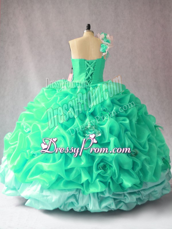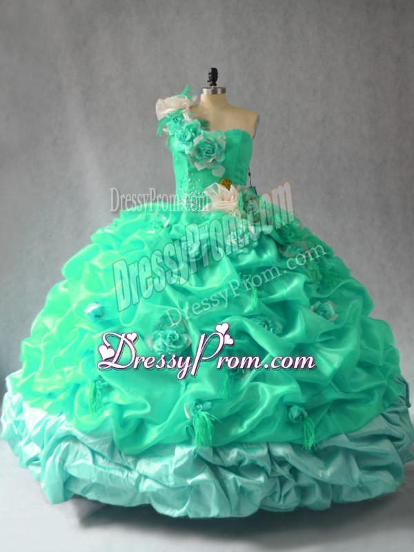 Neckline : One shoulderShown Color : TurquoiseSilhouette : Ball GownsSleeve Length : sleevelessHemline : floor lengthBack Detail : Lace upFabric : OrganzaEmbellishment : Pick Ups,Hand Made FlowerOccasion : Sweet 16,QuinceaneraSeason : Spring,Summer,Fall,Winter