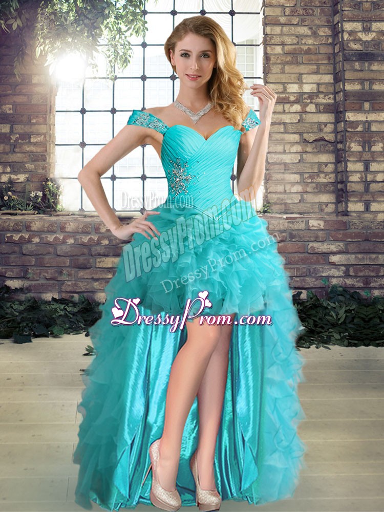 Neckline : Off the shoulder Shown Color : Aqua Blue Silhouette : A-line Sleeve Length : sleeveless Hemline : high low Back Detail : Lace up Fabric : Organza Embellishment : Beading,Ruffles Occasion : Prom,Party Season : Spring,Summer,Fall,Winter