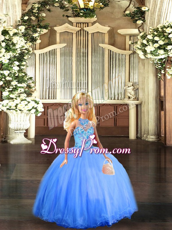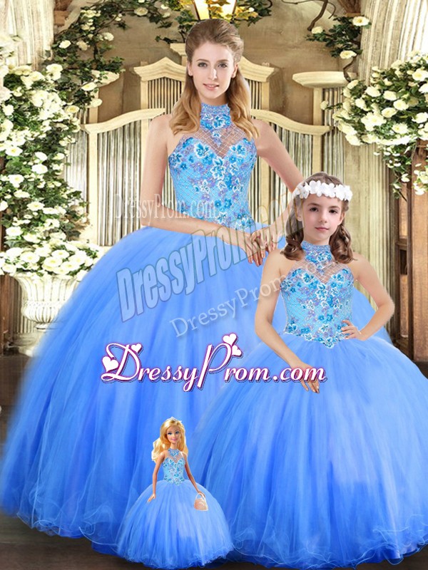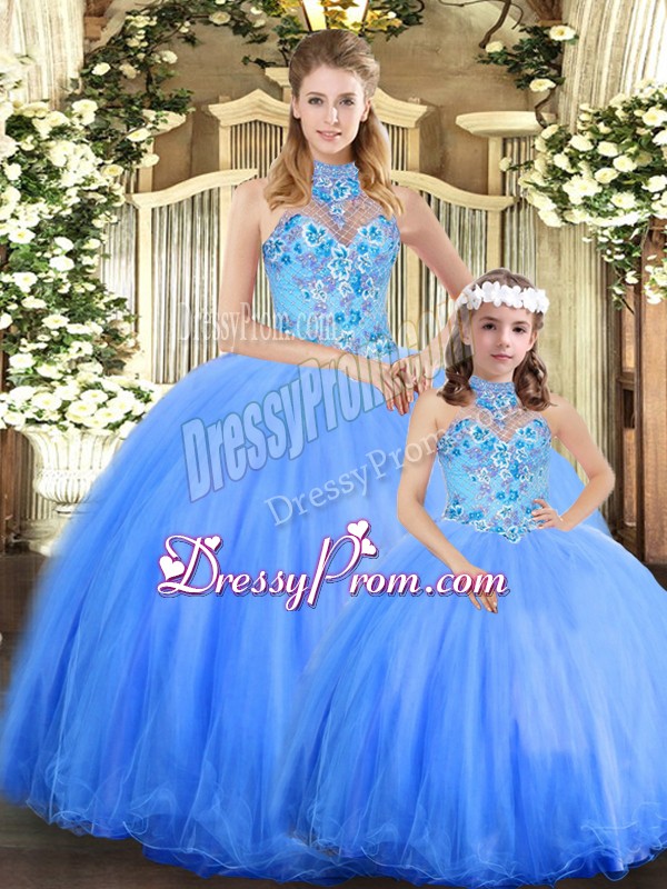 Neckline : Halter topShown Color : BlueSilhouette : Ball GownsSleeve Length : sleevelessHemline : floor lengthBack Detail : Lace upFabric : TulleEmbellishment : EmbroideryOccasion : Sweet 16,QuinceaneraSeason : Spring,Summer,Fall,Winter