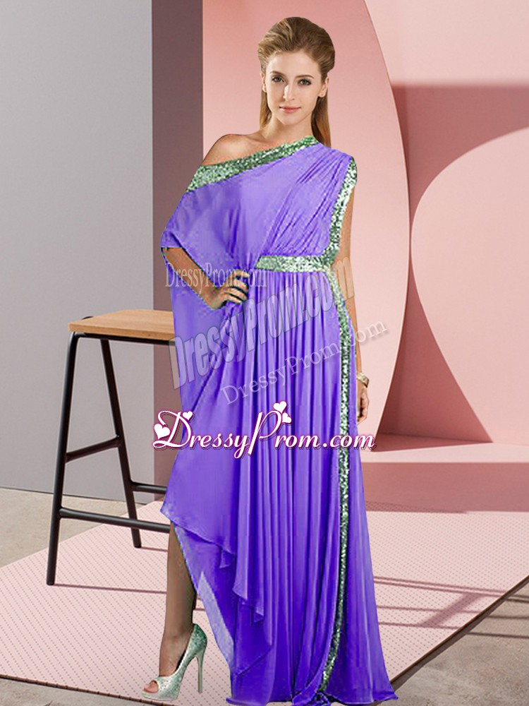Neckline : One shoulderShown Color : LavenderSilhouette : EmpireSleeve Length : sleevelessHemline : asymmetricalBack Detail : Side zipperFabric : ChiffonEmbellishment : SequinsOccasion : Prom,PartySeason : Spring,Summer,Fall,Winter