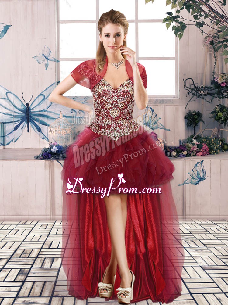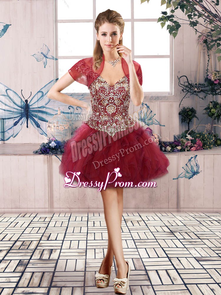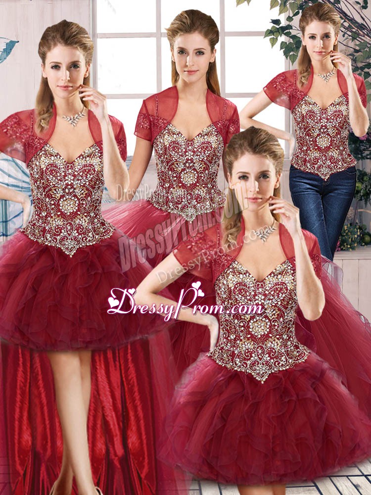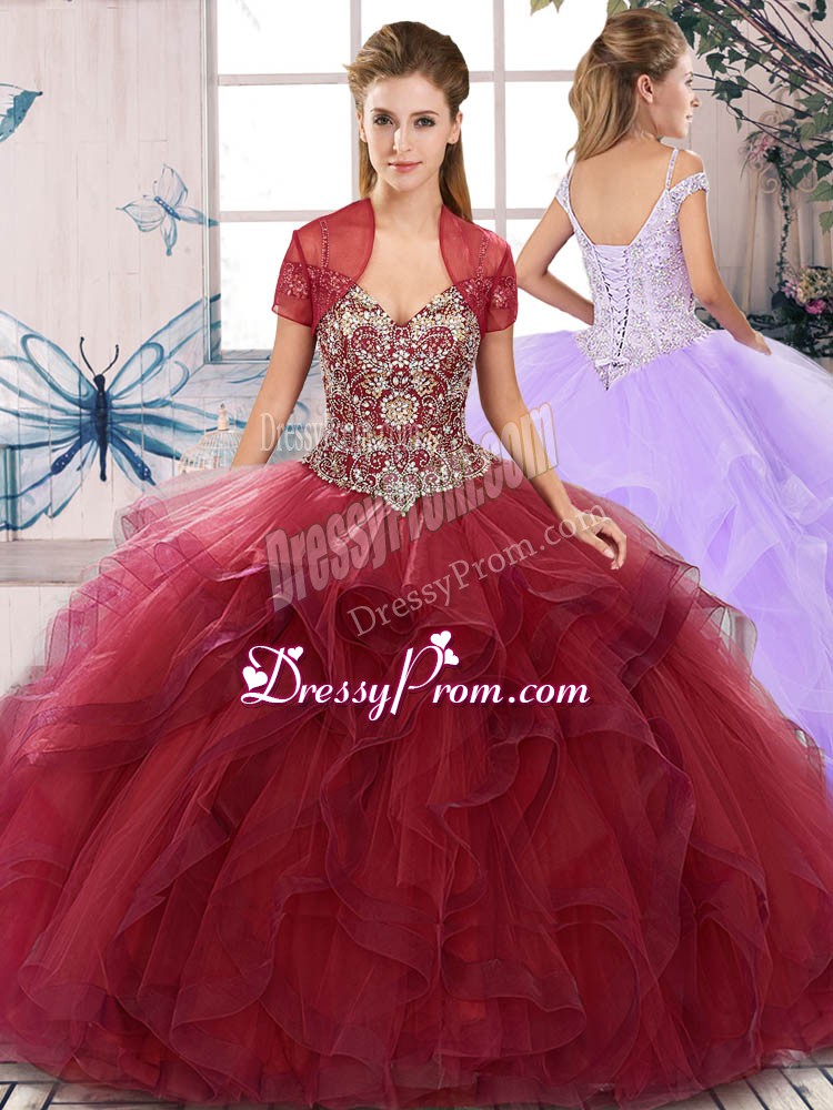 Neckline : Off the shoulderShown Color : BurgundySilhouette : Ball GownsSleeve Length : sleevelessHemline : floor lengthBack Detail : Lace upFabric : TulleEmbellishment : Beading,RufflesOccasion : Military Ball,Sweet 16,QuinceaneraSeason : Spring,Summer,Fall,Winter