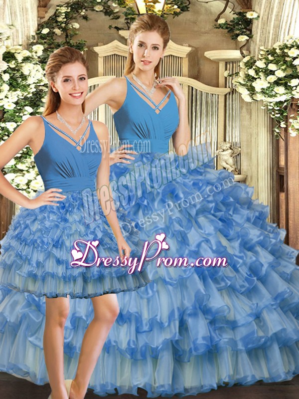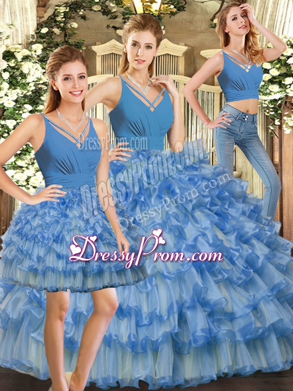 Neckline : V-neckShown Color : BlueSilhouette : Three PiecesSleeve Length : sleevelessHemline : floor lengthBack Detail : BacklessFabric : OrganzaEmbellishment : Ruffles,Ruffled LayersOccasion : Sweet 16,QuinceaneraSeason : Spring,Summer,Fall,Winter