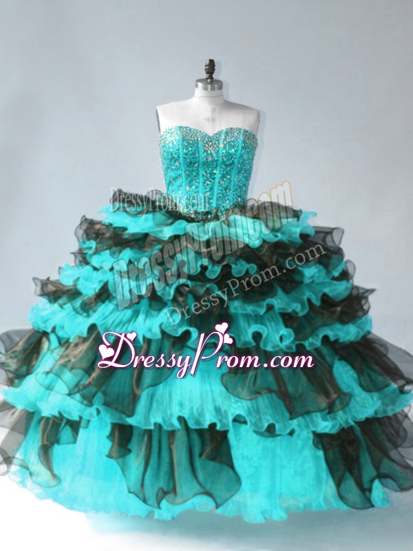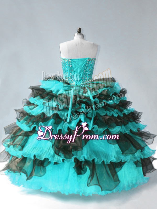 Neckline : SweetheartShown Color : Blue And Black Silhouette : Ball GownsSleeve Length : sleevelessHemline : floor lengthBack Detail : Lace upFabric : OrganzaEmbellishment : Beading,Ruffled LayersOccasion : Sweet 16,QuinceaneraSeason : Spring,Summer,Fall,Winter