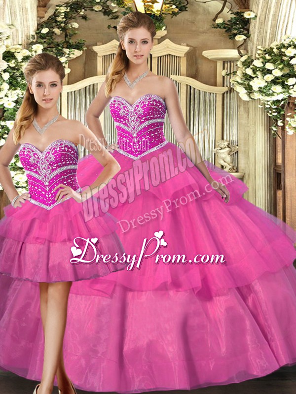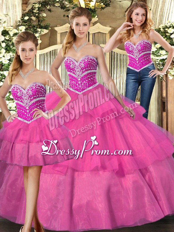 Neckline : SweetheartShown Color : LilacSilhouette : Three PiecesSleeve Length : sleevelessHemline : floor lengthBack Detail : Lace upFabric : TulleEmbellishment : Beading,Ruffled LayersOccasion : Sweet 16,QuinceaneraSeason : Spring,Summer,Fall,Winter