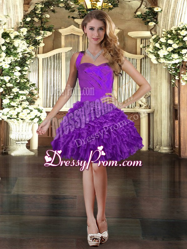 Neckline : Halter topShown Color : PurpleSilhouette : Ball GownsSleeve Length : sleevelessHemline : mini lengthBack Detail : Lace upFabric : OrganzaEmbellishment : RufflesOccasion : Prom,PartySeason : Spring,Summer,Fall