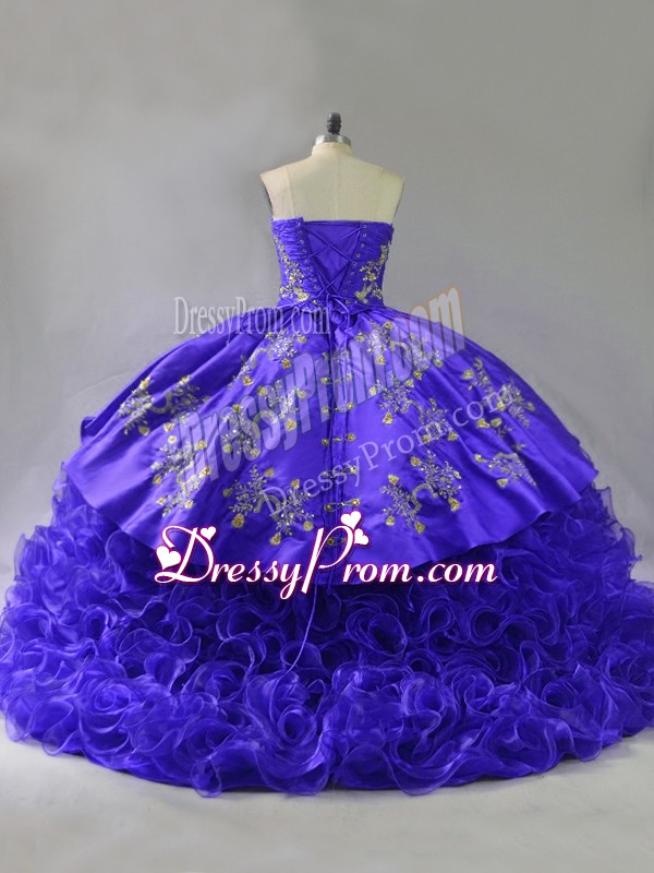 Neckline : SweetheartShown Color : PurpleSilhouette : Ball GownsSleeve Length : sleevelessHemline : floor lengthBack Detail : Lace upFabric : Fabric With Rolling FlowersEmbellishment : Embroidery,RufflesOccasion : Sweet 16,QuinceaneraSeason : Spring,Summer,Fall,Winter