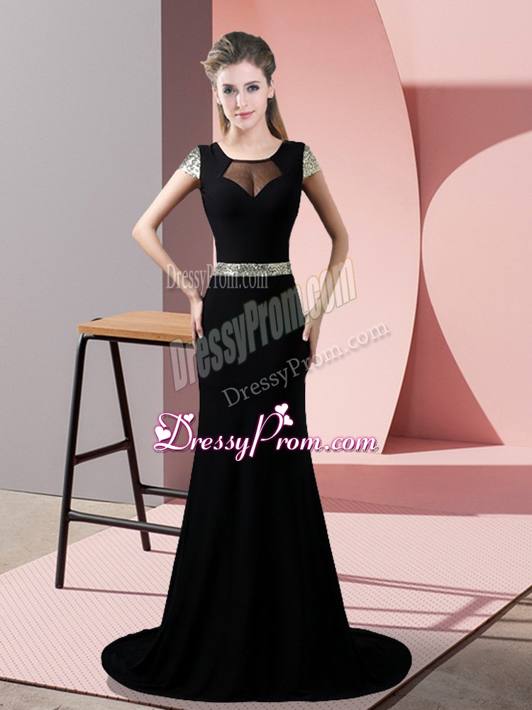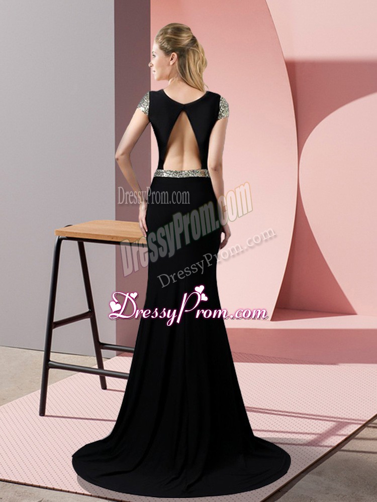 Neckline : SquareShown Color : BlackSilhouette : MermaidSleeve Length : short sleevesBack Detail : BacklessFabric : SatinEmbellishment : SequinsOccasion : Prom,PartySeason : Spring,Summer,Fall,Winter