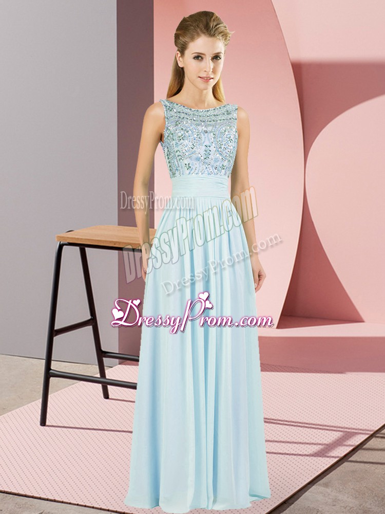 Neckline : ScoopShown Color : Light BlueSilhouette : EmpireSleeve Length : sleevelessHemline : floor lengthBack Detail : BacklessFabric : ChiffonEmbellishment : BeadingOccasion : Prom,Party,Military Ball,Sweet 16Season : Spring,Summer,Fall,Winter