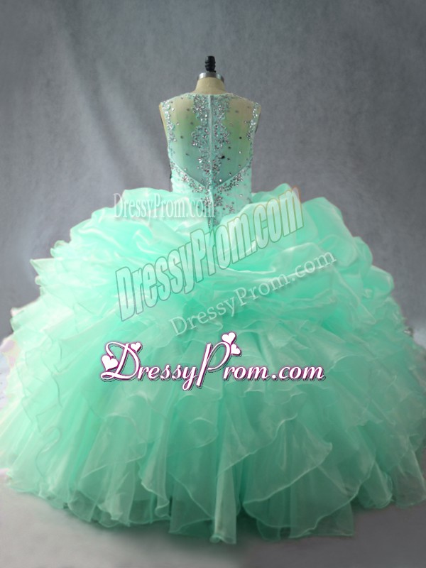 Neckline : StrapsShown Color : Apple GreenSilhouette : Ball GownsSleeve Length : sleevelessHemline : floor lengthBack Detail : ZipperFabric : OrganzaEmbellishment : Beading,Ruffles,Pick UpsOccasion : Sweet 16,QuinceaneraSeason : Spring,Summer,Fall,Winter