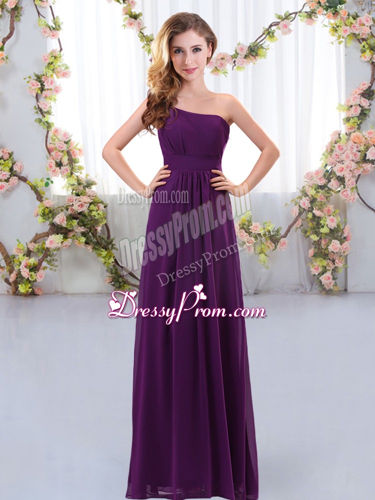 Neckline : One shoulderShown Color : Dark PurpleSilhouette : EmpireSleeve Length : sleevelessHemline : floor lengthBack Detail : ZipperFabric : ChiffonEmbellishment : RuchingSeason : Spring,Summer,Fall,Winter