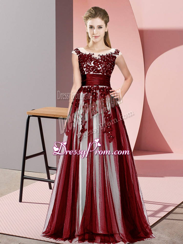 Neckline : ScoopShown Color : BurgundySilhouette : EmpireSleeve Length : sleevelessHemline : floor lengthBack Detail : ZipperFabric : TulleEmbellishment : Beading,LaceOccasion : Wedding PartySeason : Spring,Summer,Fall,Winter