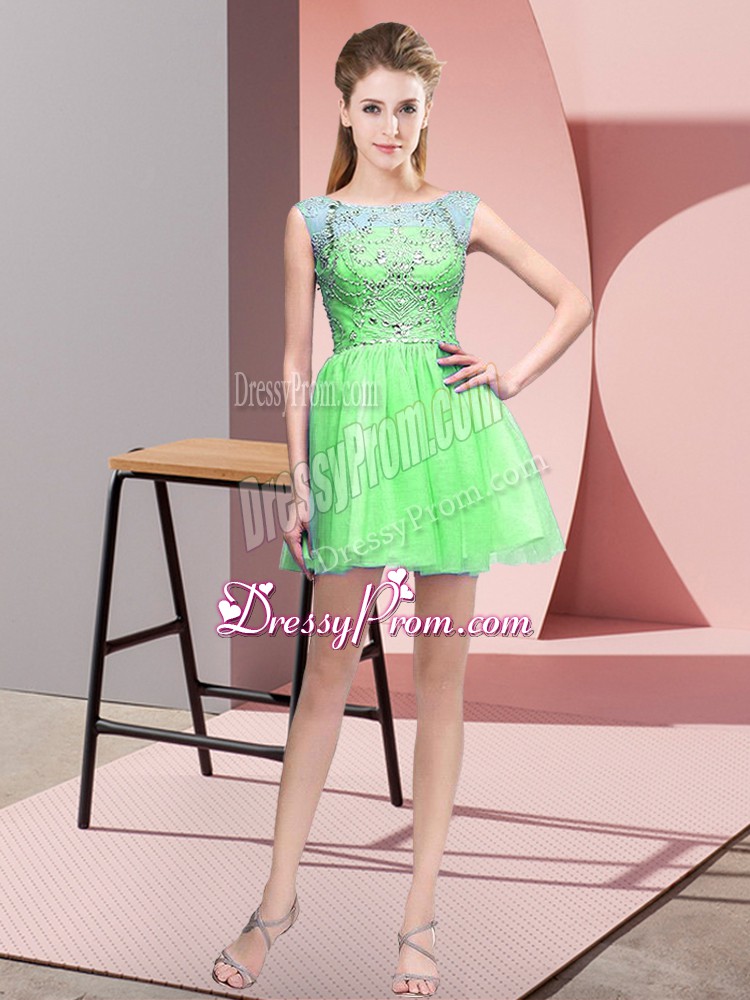Neckline : BateauShown Color : Spring GreenSilhouette : A-lineSleeve Length : sleevelessHemline : mini lengthBack Detail : ZipperFabric : TulleEmbellishment : BeadingOccasion : Prom,PartySeason : Spring,Summer,Fall