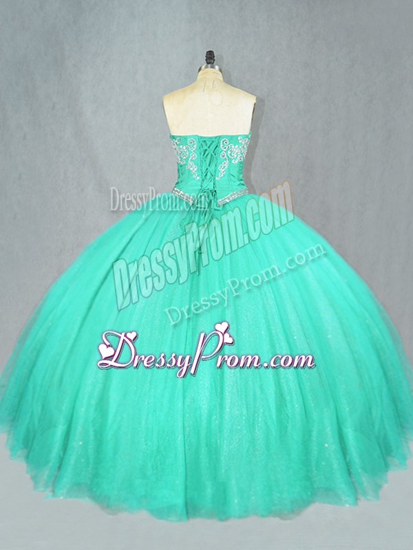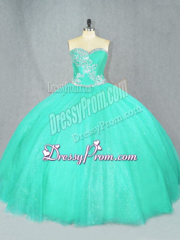 Neckline : SweetheartShown Color : TurquoiseSilhouette : Ball GownsSleeve Length : sleevelessHemline : floor lengthBack Detail : Lace upFabric : TulleEmbellishment : BeadingOccasion : Sweet 16,QuinceaneraSeason : Spring,Summer,Fall,Winter