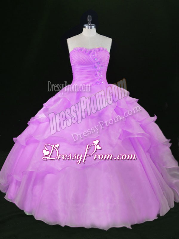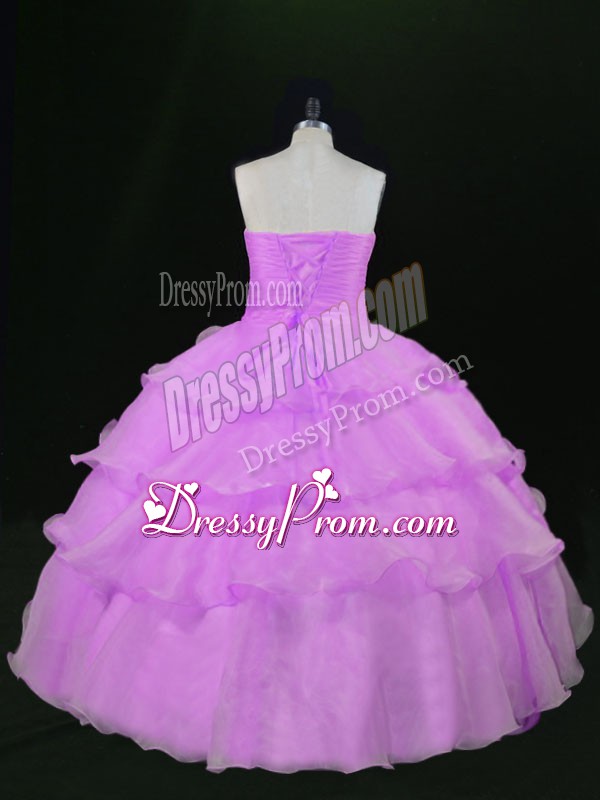 Neckline : SweetheartShown Color : LavenderSilhouette : Ball GownsSleeve Length : sleevelessHemline : floor lengthBack Detail : Lace upFabric : OrganzaEmbellishment : Beading,RufflesOccasion : Sweet 16,QuinceaneraSeason : Spring,Summer,Fall,Winter