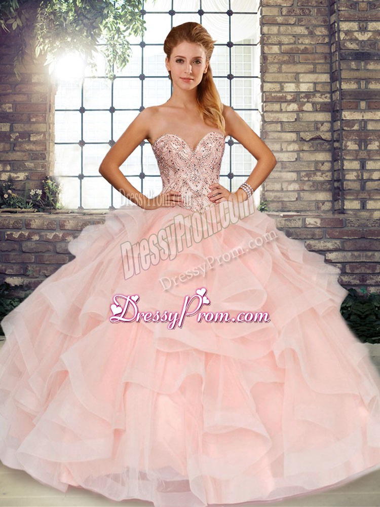 Neckline : SweetheartShown Color : Baby PinkSilhouette : Ball GownsSleeve Length : sleevelessHemline : floor lengthBack Detail : Lace upFabric : TulleEmbellishment : Beading,RufflesOccasion : Military Ball,Sweet 16,QuinceaneraSeason : Spring,Summer,Fall,Winter