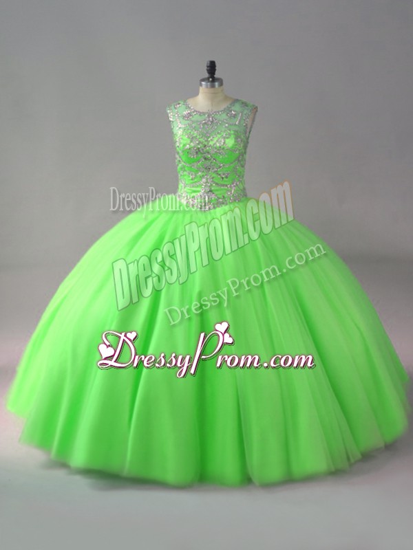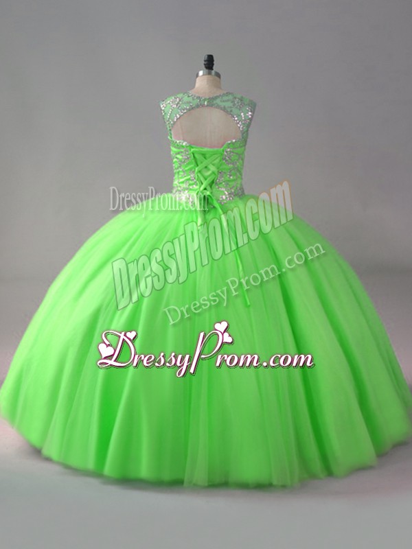 Neckline : ScoopShown Color : Spring GreenSilhouette : Ball GownsSleeve Length : sleevelessHemline : floor lengthBack Detail : Lace upFabric : TulleEmbellishment : BeadingOccasion : Sweet 16,QuinceaneraSeason : Spring,Summer,Fall,Winter
