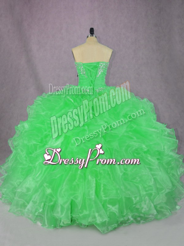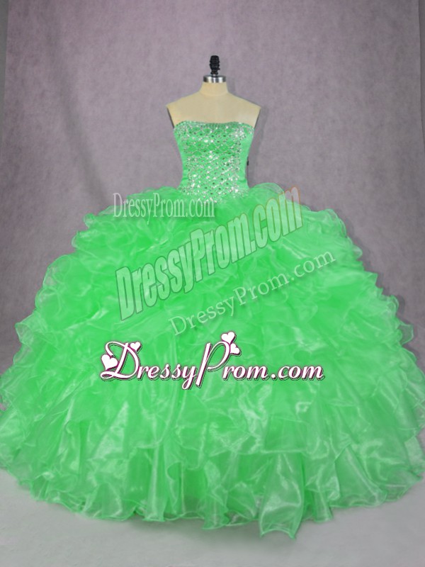 Neckline : StraplessShown Color : GreenSilhouette : Ball GownsSleeve Length : sleevelessHemline : floor lengthBack Detail : Lace upFabric : OrganzaEmbellishment : Beading,RufflesOccasion : Sweet 16,QuinceaneraSeason : Spring,Summer,Fall,Winter