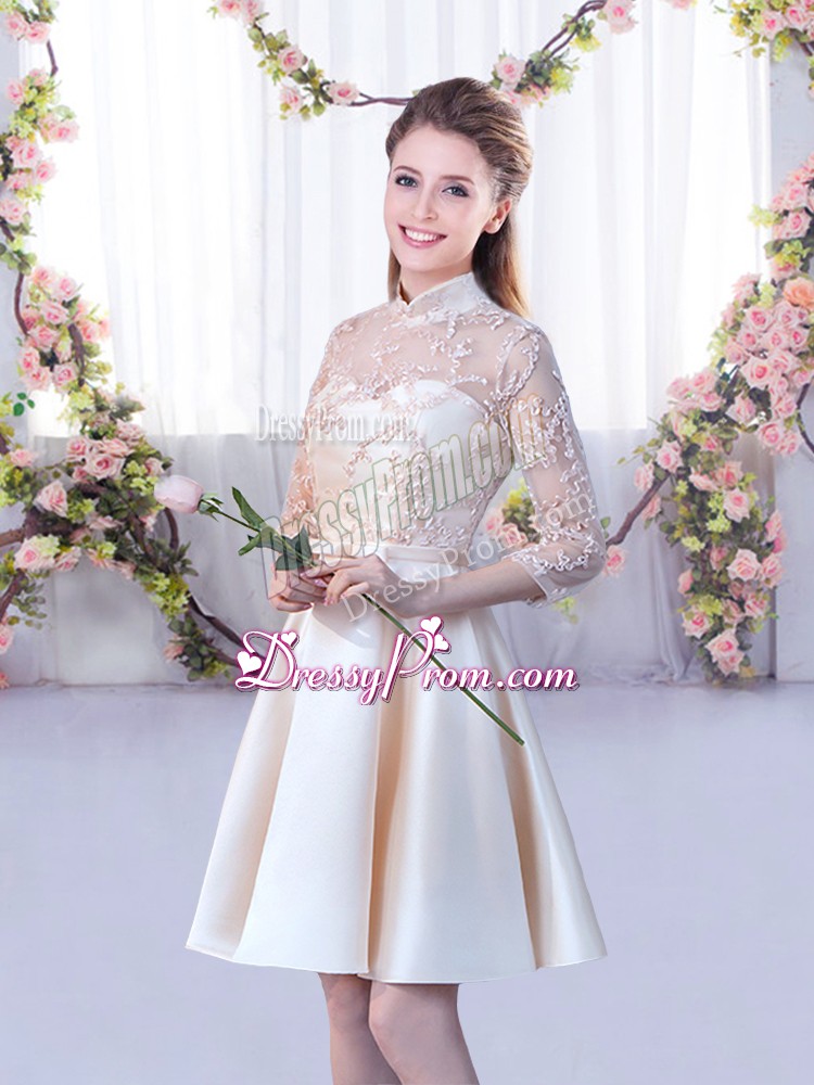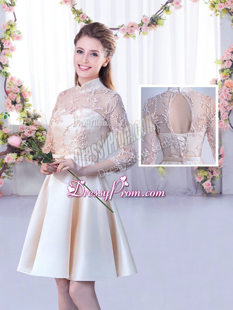 Neckline : High-neckShown Color : ChampagneSilhouette : A-lineSleeve Length : half sleevesHemline : mini lengthBack Detail : Lace upFabric : SatinEmbellishment : Lace,BeltOccasion : Wedding PartySeason : Spring,Summer,Fall