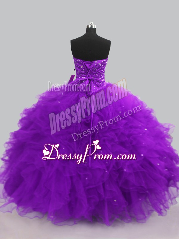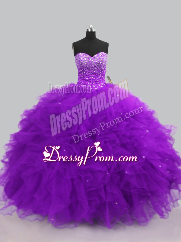 Affordable Purple Ball Gowns Beading and Ruffles Sweet 16 Dresses Lace Up Tulle Sleeveless Floor Length