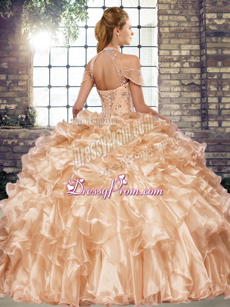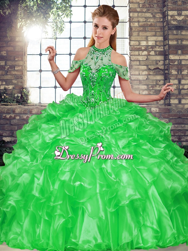 Neckline : Halter topShown Color : GreenSilhouette : Ball GownsSleeve Length : sleevelessHemline : floor lengthBack Detail : Lace upFabric : OrganzaEmbellishment : Beading,RufflesOccasion : Military Ball,Sweet 16,QuinceaneraSeason : Spring,Summer,Fall,Winter