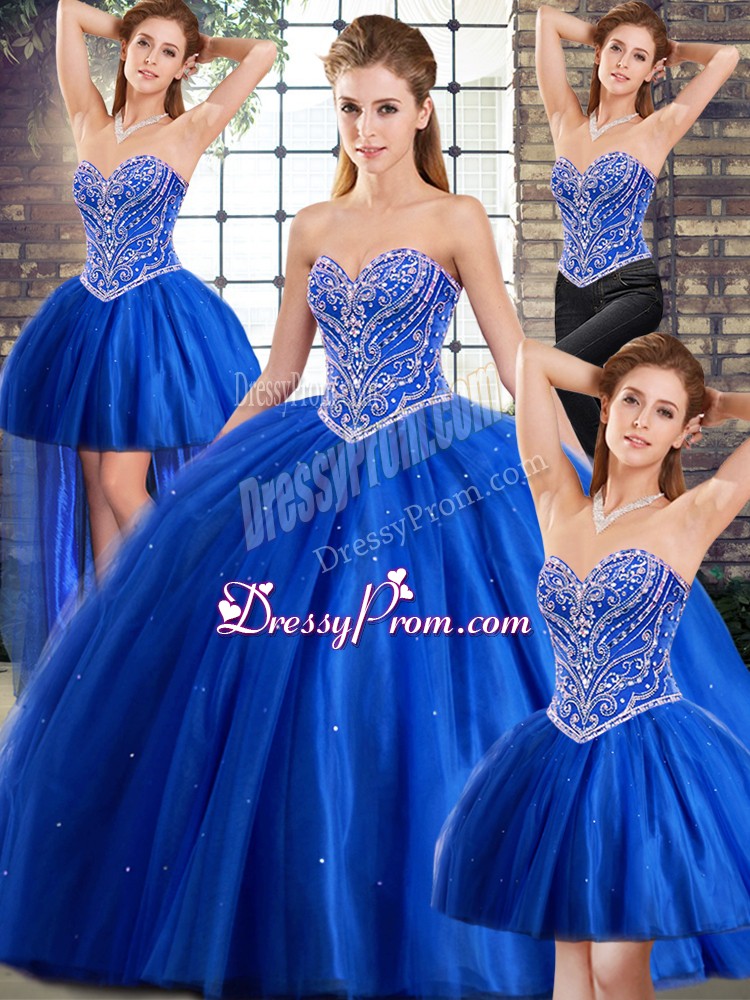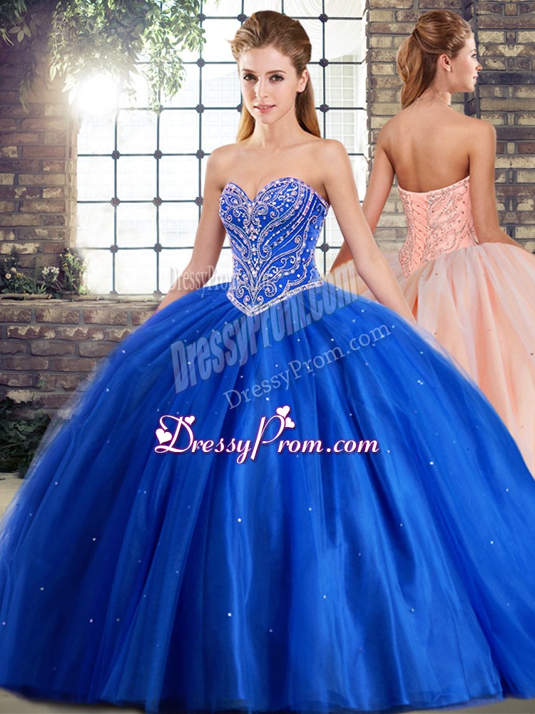 Neckline : SweetheartShown Color : BlueSilhouette : Ball GownsSleeve Length : sleevelessBack Detail : Lace upFabric : TulleEmbellishment : BeadingOccasion : Military Ball,Sweet 16,QuinceaneraSeason : Spring,Summer,Fall,Winter