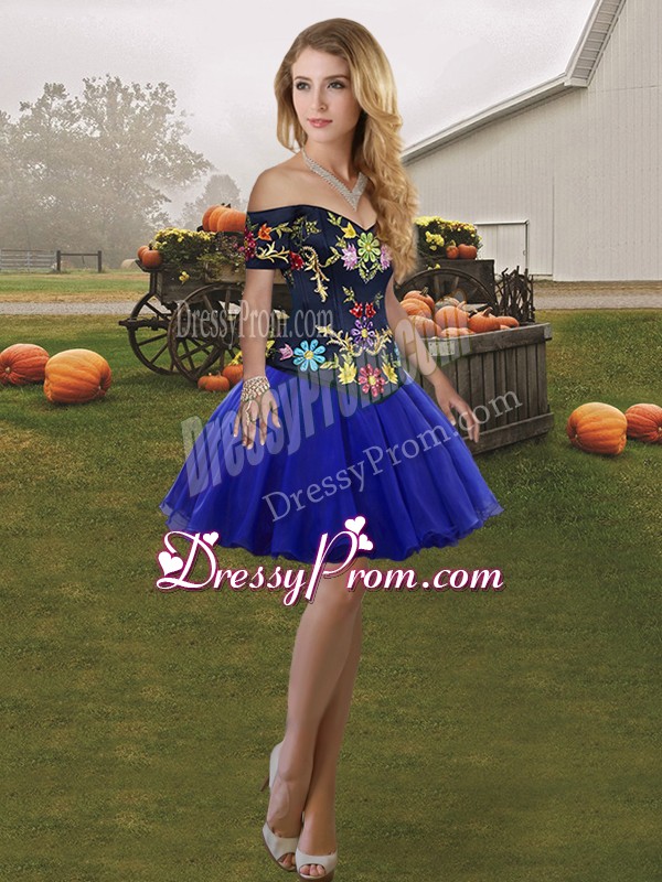 Low Price Royal Blue Ball Gowns Tulle Off The Shoulder Sleeveless Embroidery Mini Length Lace Up Evening Dress