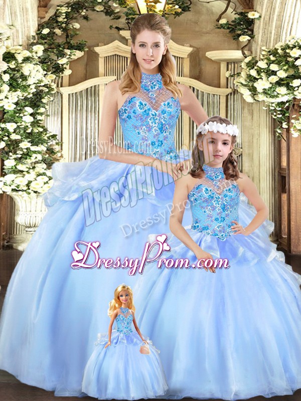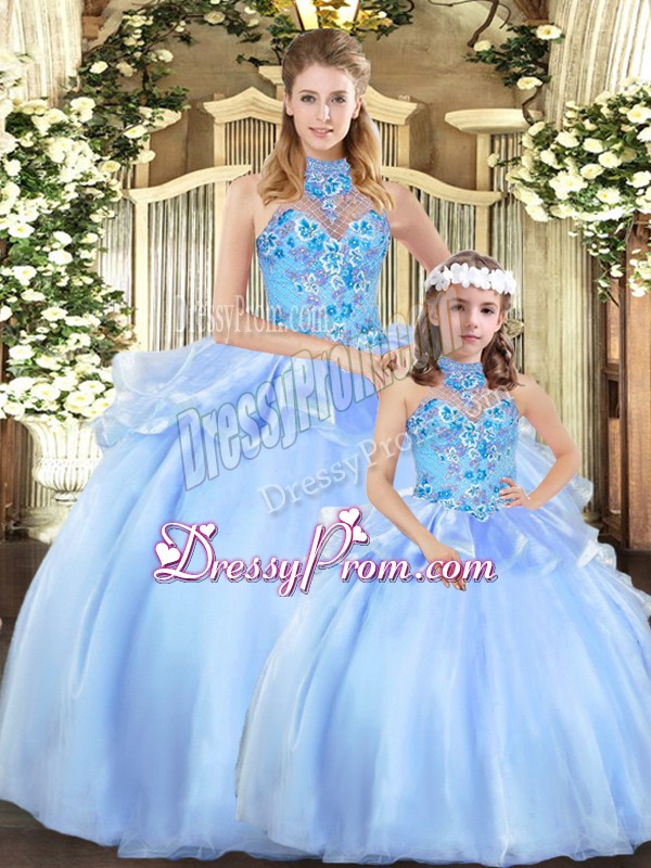 Neckline : Halter topShown Color : BlueSilhouette : Ball GownsSleeve Length : sleevelessHemline : floor lengthBack Detail : Lace upFabric : OrganzaEmbellishment : EmbroideryOccasion : Military Ball,Sweet 16,QuinceaneraSeason : Spring,Summer,Fall,Winter