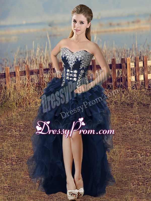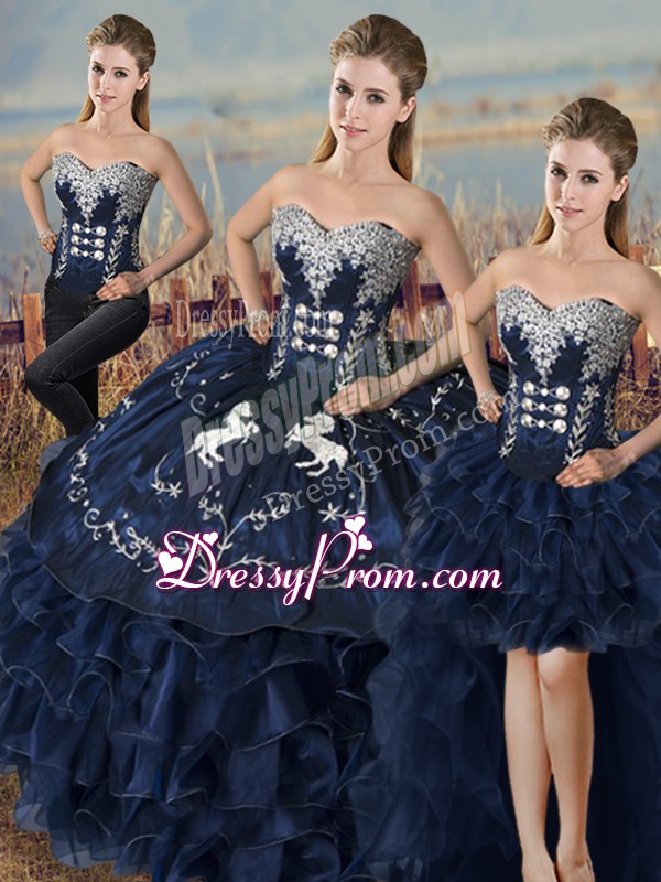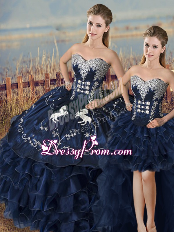 Neckline : SweetheartShown Color : Navy BlueSilhouette : Ball GownsSleeve Length : sleevelessBack Detail : Lace upFabric : Satin,OrganzaEmbellishment : Embroidery,RufflesOccasion : Sweet 16,QuinceaneraSeason : Spring,Summer,Fall,Winter