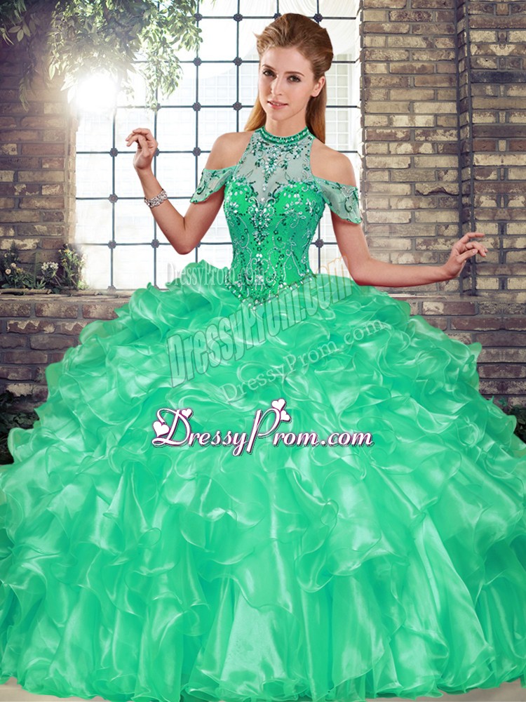Neckline : Halter topShown Color : TurquoiseSilhouette : Ball GownsSleeve Length : sleevelessHemline : floor lengthBack Detail : Lace upFabric : OrganzaEmbellishment : Beading,RufflesOccasion : Military Ball,Sweet 16,QuinceaneraSeason : Spring,Summer,Fall,Winter